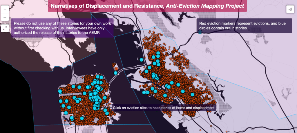 The Anti-Eviction Mapping Project is a data visualization, data analysis, and oral history collective documenting gentrification and resistance in the San Francisco Bay Area. In this article, we discuss the history and methodology of our narrative mapmaking, situating our work in the tradition of critical geography, critical race studies, as well as feminist and decolonial science studies. Aligned with activist work that is fighting for a future beyond the current tech-dominated political economy of speculative real estate and venture capital, our project maps sites of resistance, while remembering spaces lost and struggled for. In this article, we highlight the connections between countermapping, oral history, and housing justice work.